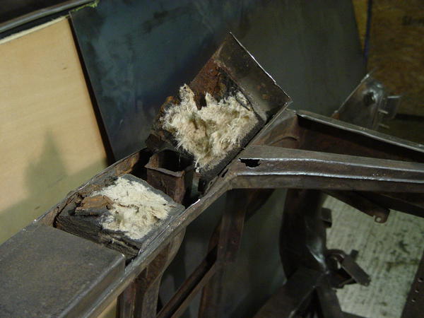 While you're in there you may find something like this. It is blocks of mineral wool installed at the factory prior to welding the frame together. Purpose is for sound deadening. It reduces pinging and ringing sounds when the frame may be peppered by road rocks or otherwise subject to high frequency vibration. I don't think the stuff promotes rust. The MGA frame rusts from the outside and is typically very clean inside, until the outside rust breaks through and allows water inside.