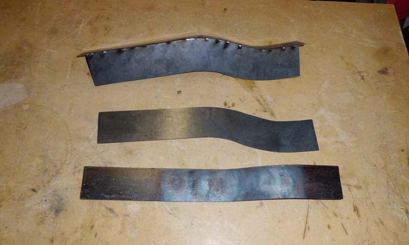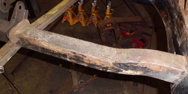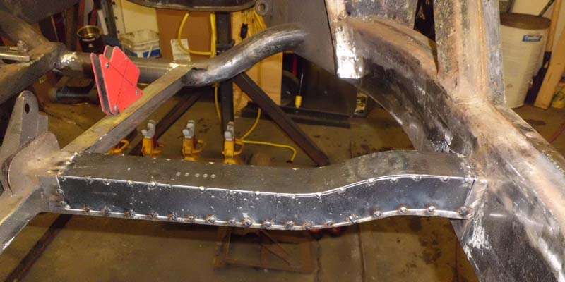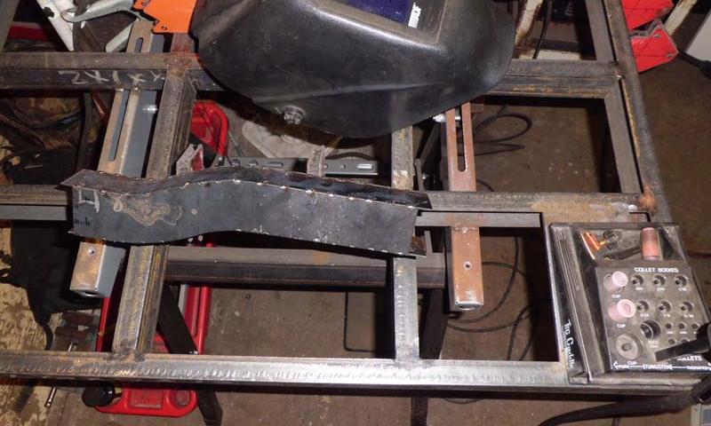 "Started tackling the RH square cross member this morning. The bottoms of both sides of the cross member are actually in good shape other than a few dents, and even still had some original black paint in place. The top and sides are another matter, however, with severe pitting and rust through in spots, and others where a prick punch penetrated easily. I wound up cutting out the flat sides (but not full height), and then clamping them together and match grinding. Then I cut a 2" wide strip for the top, and formed it to the shape of the existing piece using a torch and clamps. I used the cross member itself as a jig for tack welding the first side to the new top piece, then clamped the other side in place using bits of angle iron and tack welded. Then I marked the cross member and removed the top and all but about 1/4" of the sides, until the repair piece nested in place".