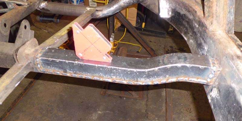 For the square cross member at the floorboards, I bought some 2" square tubing, and cut out the sides where it needed to bend. I fit in into a jig I made, then cut some new side pieces from 14-Ga and welded them into place.