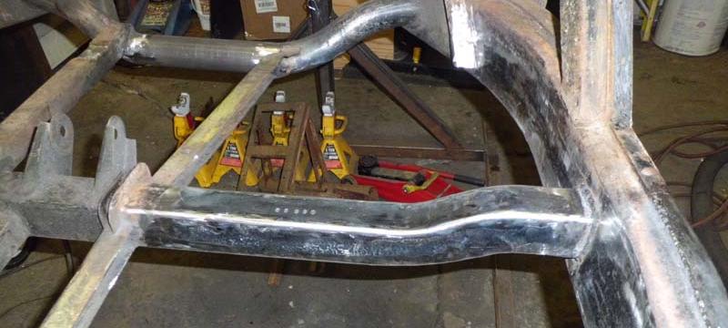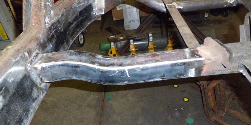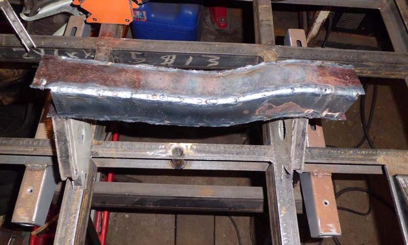 Corners ground/smoothed. There are some spots where I could lay in more weld bead, and re-smooth for a slightly better appearance, but as was so astutely pointed out, it's just going to be covered by carpet anyway. Crossmember welded into place.