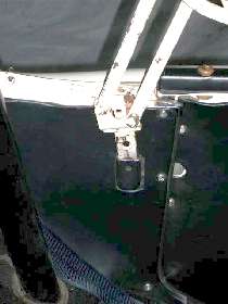 I have modified the hood mounting to allow the soft hood to be fitted quickly and with minimum fuss. It cannot be carried in the car in the folded position as this space is now taken by the roll bar. I store the soft hood in my garage and fit it as necessary. This requires a degree of planning as, if you think it may rain, then you fit the hood before leaving on a trip, or get wet. I usually find it is the latter! The mounting brackets are from MGB and screwed to the body, the MGA hood frame brackets have been detached from the body and simply cut with a hacksaw so they slide easily into the bracket (see photo). The hood is a quick and easy fit.