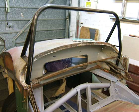 There are a few problems with this one. First, I don't know if the folding top would actually reach over top of the roll bar. Second, the top frame obviously does not quite fit in between the legs of the main hoop. The top might stow in that position behind the seats if you left out the side curtain stowage bag. Third, there is no side to side angle brace in this weldment, so side impact strength is limited. But the more serious concern is that this roll bar is not attached to the chassis frame. It is bolted to the body sheet metal on the battery shelf aft of the door opening and in front of the inner wheel arch. It is likewise bolted to the sheet metal on the body tonneau panel (not extending through into the boot). In event of a roll over this would likely cause a lot of sheet metal damage, bus as said it might be better than nothing for prospects of saving your life.