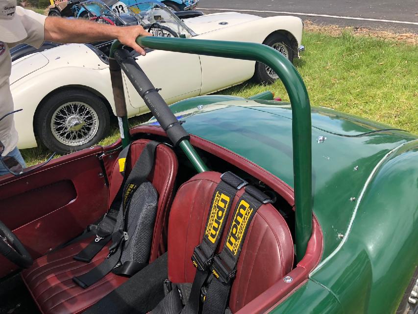 "Attached are some photos of another Roll Bar in Oz. Notice how the bar is set further rearward by cutting into the rear cockpit rail (easily reversible). It also has rear bracing back to the wheel arches and a cross rail for fixing full harness seat belts. It has a removable front support that is not shown in these photos (owner only puts it in for circuit events). Unit is removable, relatively easily. It was manufactured by Brown Davis - https://rollcage.com.au - Installed cost was around $A2,000".