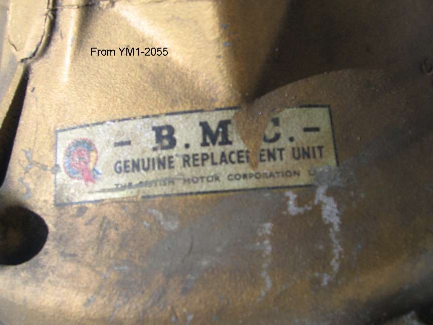 "My car, YM1-2055 was built from 01-05-1959. It has engine number 16GB/U/1659 and gearbox number A1662. The strange thing is that the gearbox is a BMC gold seal unit. The date that is stamped on the gearbox adjacent to the clutch slave cylinder mounting point is 19-2-59. There is also a round aluminum disc that has been attached after it was painted gold that reads, Type 14452. On the top of the box is painted/stenciled, the part number for a Twin Cam gearbox, 1H3282. It could be reasonable for me to conclude that the original gearbox from the car was sent back to the factory, overhauled and reunited with the car."