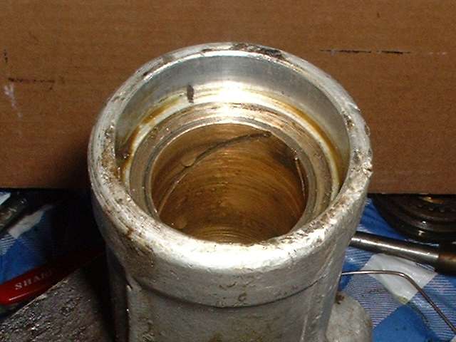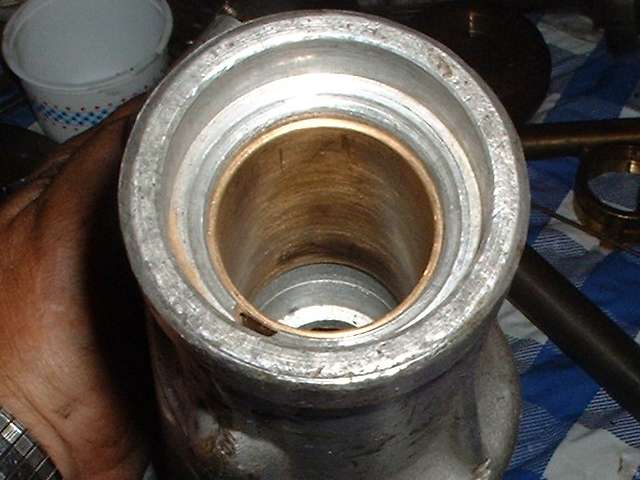 "I went to the machine shop to have the tail shaft bushing removal washer made. Instead, he had the old one out in less than 5 minutes. The bushing has a natural split in the top and all he did was take a small diameter round pointed punch and drove it in close to the split collapsing that part of the bushing about halfway down the length. Then, from the other end inserted a long slender brass drift and caught the collapsed end of the bushing and using a small hammer drove it out. Literally 5 minutes."