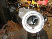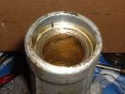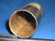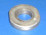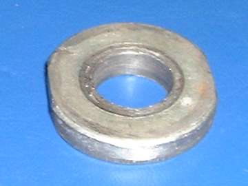 The bore this bushing is situated in has a wide internal shoulder at the front end, so it requires some special finesse to remove the bushing. I made the small tool shown on the left below, a heavy flat washer with a pair of flats cut on the edges. 1.47" OD x .63" ID x .25 thick, 1.34" across the flats, and a 1/32" chamfer on one side. This will drop through the bushing, square up behind it, and can be pulled with 5/8" (or maybe 1/2") fine threaded rod and hex nuts and flat washers. Using a large wrench socket for an outer shell completes the home made bushing puller.