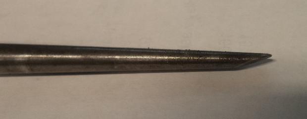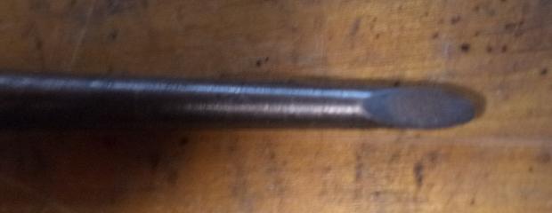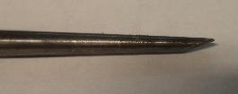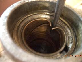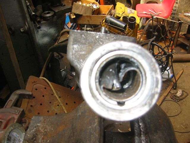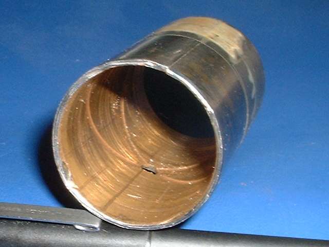 "Finally I arrived at the right approach using punches, and it was truly a 5 minute job. I used a modified long taper punch with a chisel point placed at the split. The flat side of the point faces the center of the bore. Following up with an unmodified larger taper punch to collapse it even further I was able to simply lift the collapsed bushing out with pliers. Finding the barely visible joint requires carefully examining the end of the bushing with a magnifying glass since wear marks on the bore of the bushing mask the joint".