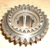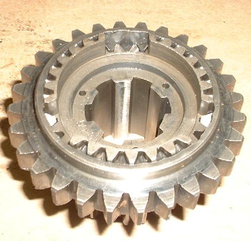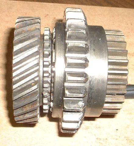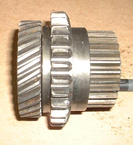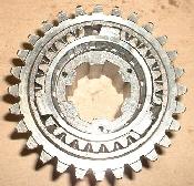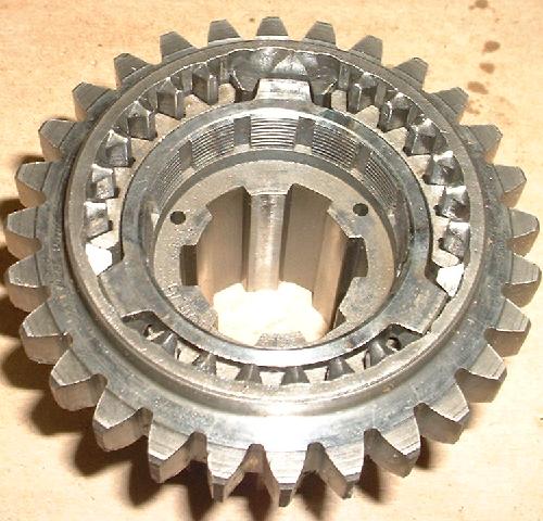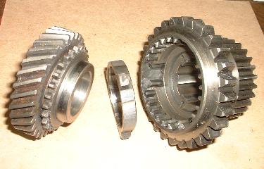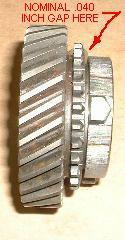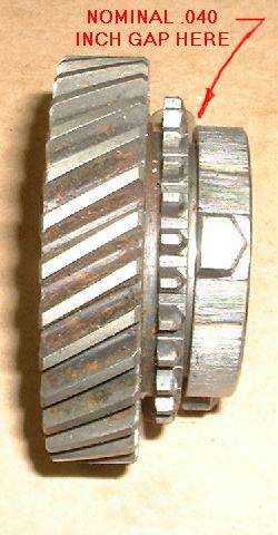 Photo at left, 2nd gear with synchro ring. When pressed together there should be about 0.040-inch space between the mating flat faces. If the cone wears enough for the gap to be .020 or less it would be time to replace the synchro ring. If the "upgrade" steel ring is installed on the original issue gear the flat faces will touch and the synchronizer will not work.