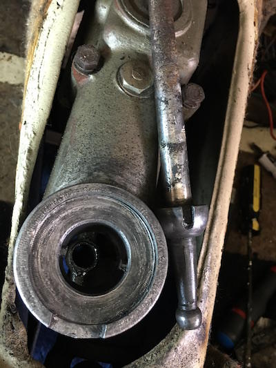 5. Pull up on the lever to remove it. Make sure there is a ball bearing in the lever socket hole (Item 148 in the Moss catalog).