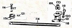 shown on the previous page). As the hand shift lever is moved left and right, Front Selector Lever 115 moves up and down. As the hand shift lever is moved fore and aft, lever 115 moves aft and forward. This lever is choosing one of the Selectors that are attached to the three Shift Rods, and in turn moving one of the shift rods fore and aft. There is an Interlock Arm interfacing between the selector lever and the selector slots to hold two shift rods in neutral position while a third rod moves to engage the selected gear. This arrangement prevents engaging two gears at once. There is another tech page detailing How The Interlock Arm Works.