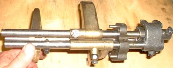 of the main gear case. A spring is pushed down into a blind hole in the block, followed by a ball. This ball and spring are to be depressed using a thin assembly tool punch while the shift rod is inserted through the block. When the shift rod hits the assembly punch, the punch can be withdrawn to allow the rod to pass through the block. The spring and ball are then trapped in the blind hole behind the rod. As the rod moves to the intended position, the detent ball can drop into a notch in the rod to secure the rod in place, preventing any further motion. Items 47 ,51, 56 are shifting forks for Reverse, 10-2, and 3-4 respectively. These will be pushed fore and aft by the shift rods.