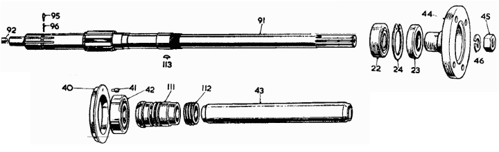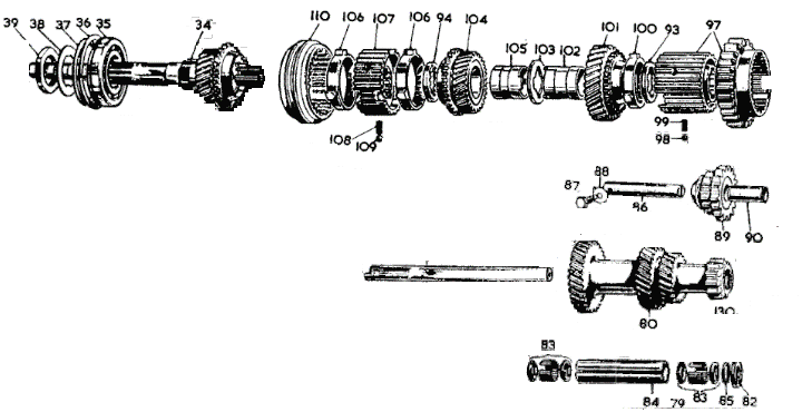 The shifting forks,items 47, 51, 56, will be pushing parts 89 (reverse gear), 97 (1-2 sliding hub) and 110 (3-4 sliding hub) respectively. Items 97 and 110 sliding hub assemblies have internal ball and spring detents (98-99, 108-109) to hold them in place while they are centered in their neutral positions.