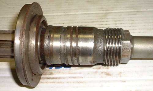 When the mainshaft turns in a clockwise direction (vehicle traveling forward), the helical groove in the pump draws oil forward. (Click for larger picture). At the front end of this helical groove is a radial hole that conducts the oil flow inward to the inside of the pump, which has a hollowed out cavity around the mainshaft. From here the oil flows into a radial hole in the mainshaft to get into an axial drilled hole in the center of the shaft, where it then flows forward towards the front of the mainshaft.