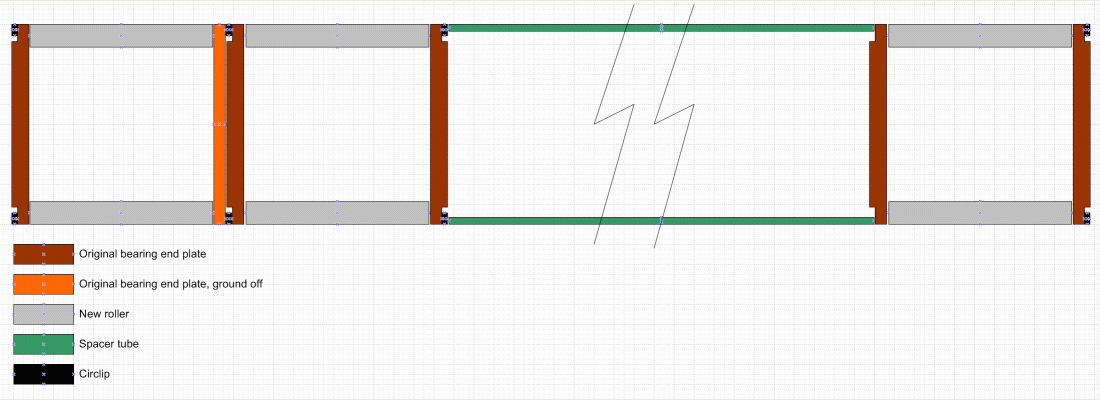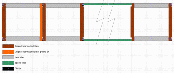 "The second ring from the left has the protruding part sanded off, the remaining rings are used to provide an axial smooth and sufficiently hard surface for the needle rollers to roll by. This way 20 needles fit like original and the axial forces are little anyway".