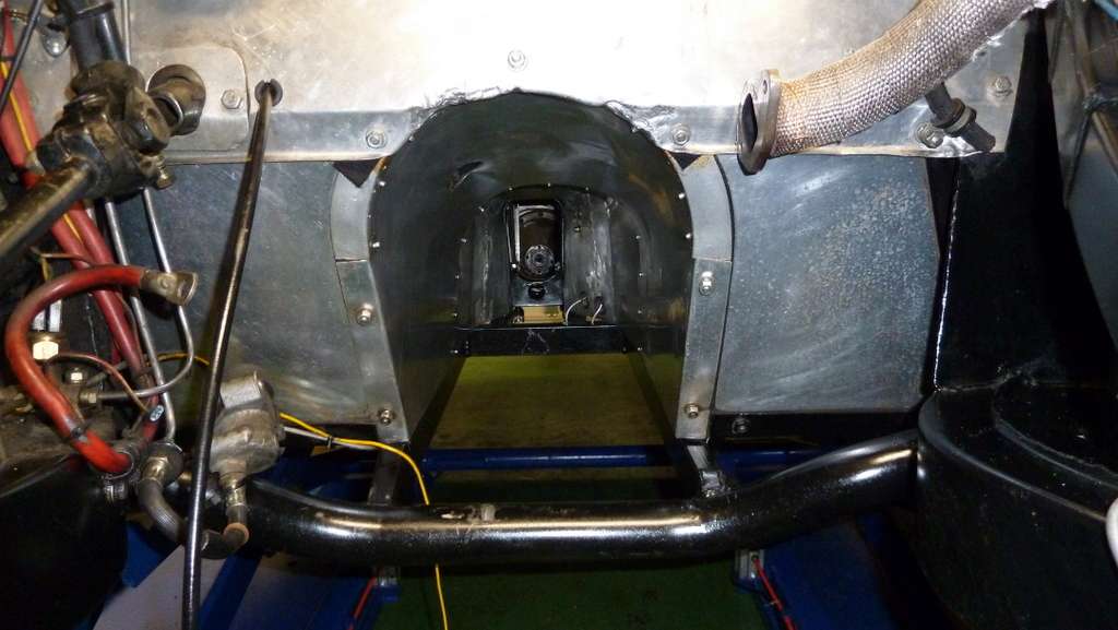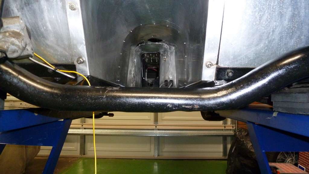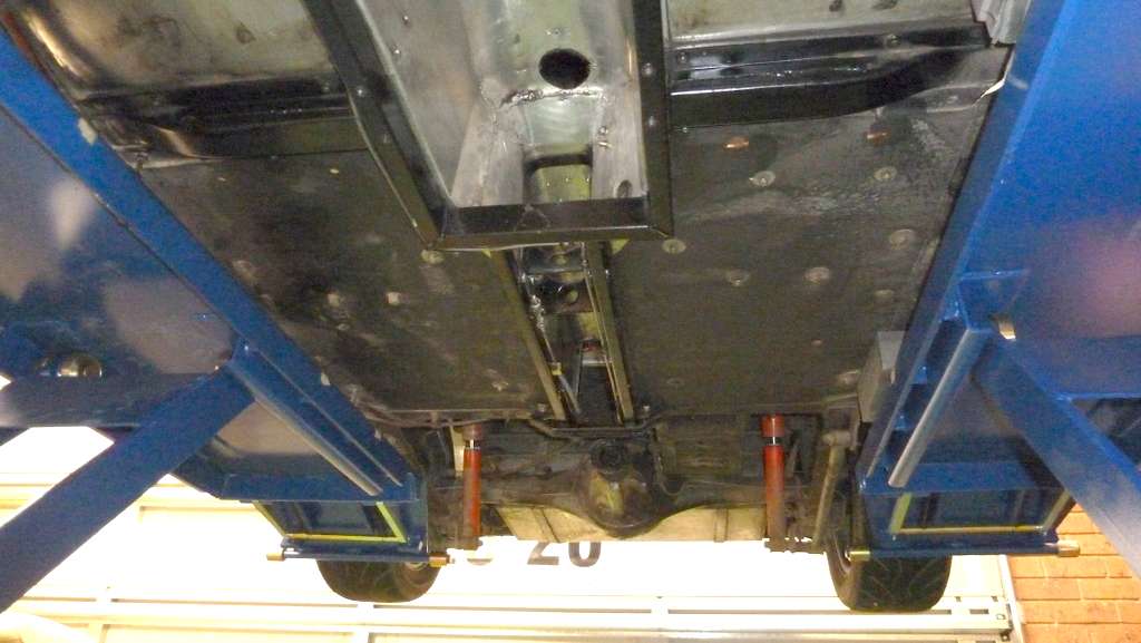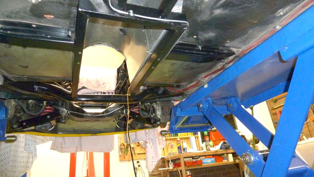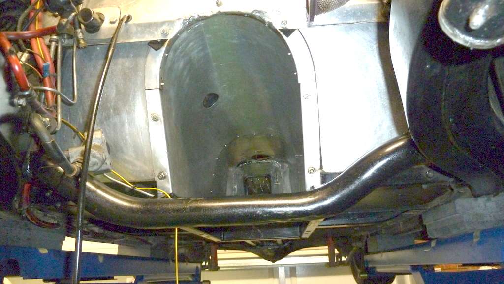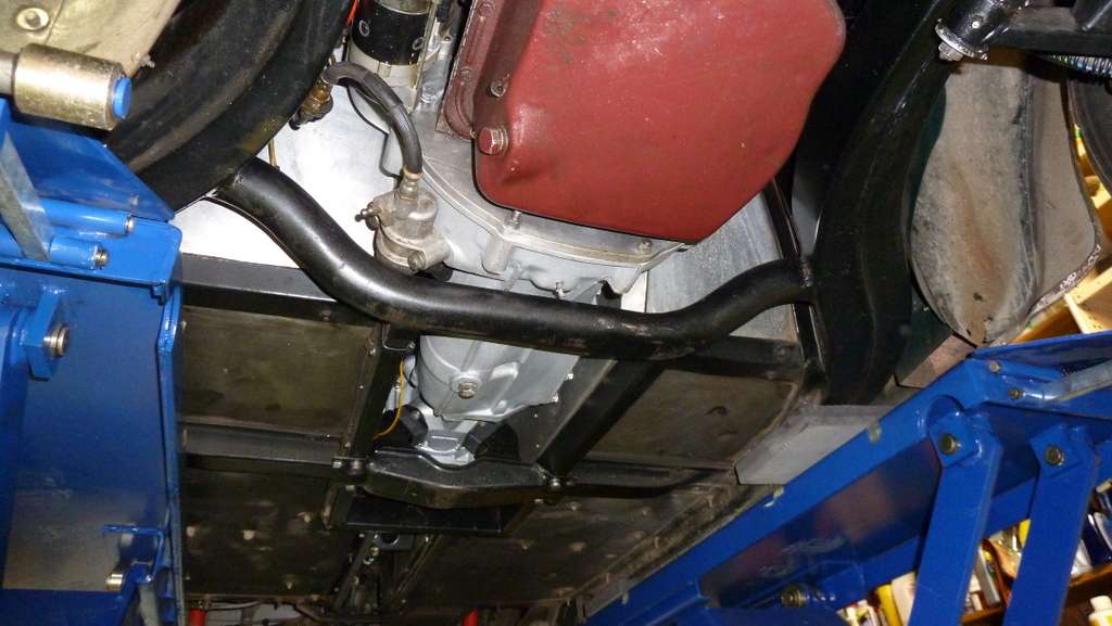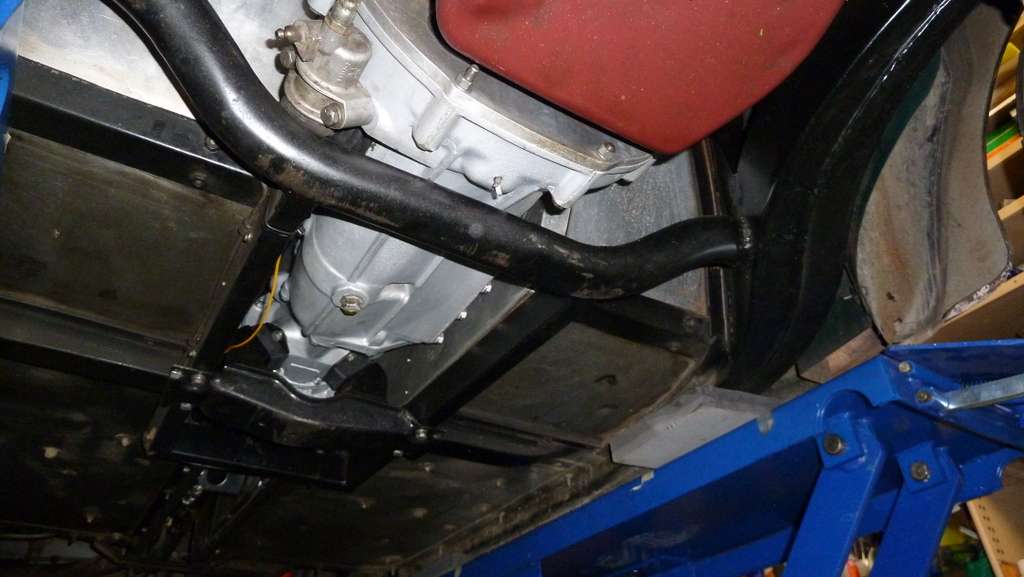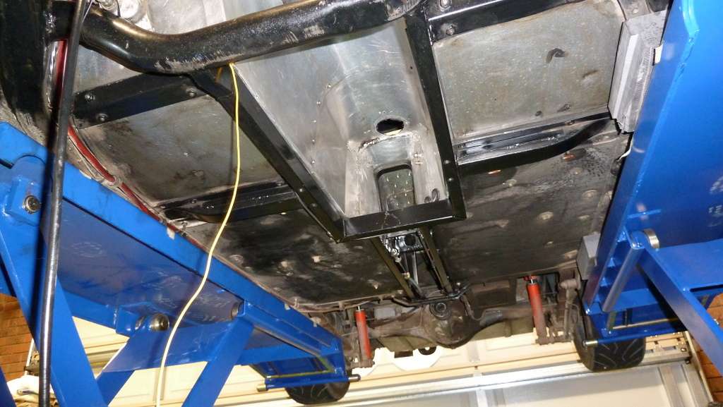 "I thought others maybe interested in how the all-synchro overdrive box has been fitted to my car. I have included a few photos of the transmission tunnel and sub frame that has been fabricated to hold the gearbox. There is a modified MGB cross member that bolts up under the rectangular frame, uses the MGB gearbox mounts. It has been shortened, cut and welded both sides. The cross member and the frame are slightly offset (~30mm, I assume because the gearbox has a bulge on one side. While I would not recommend the gearbox modification it is fun to use, attracts a lot of attention and may be of interest to someone who has a couple of MGAs and wants to build a special".