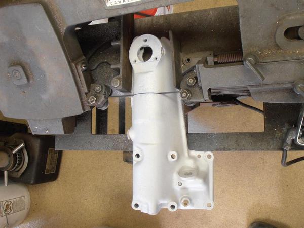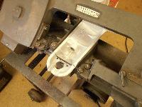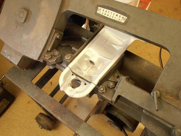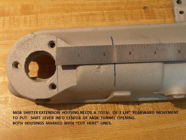 MGB shifter extension housing needs 2-1/4" rearward movement to put shift lever into center of MGA tunnel opening. Starting with two MGB extension housings, both housings are marked with "cut here" lines. A band saw makes quick work of the cutting.