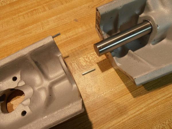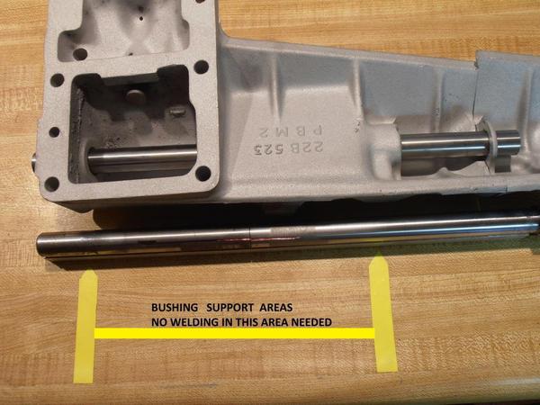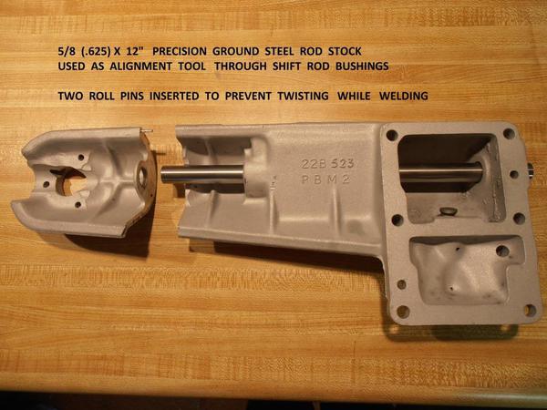5/8 (0.625)x 12" precision ground steel rod stock used as alignment tool through steel shift rod bushings. Two roll pins inserted to prevent twisting while welding.