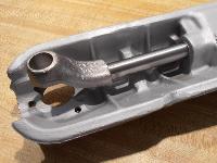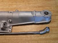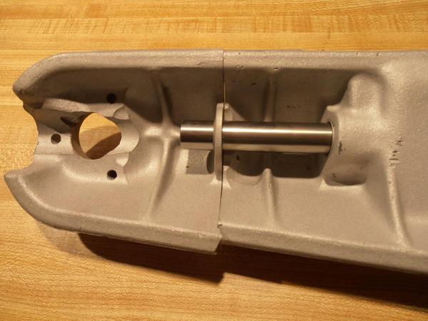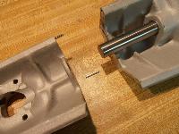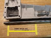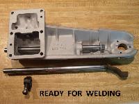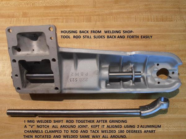 Housing back from welding shop, and tool rod still slides easily. MIG welded shift rod together after grinding a "V" notch all around joint. Kept it aligned using two aluminum channels clamped to the rod and tack welded 180 degrees apart, then rotated and welded all around. Shift rod still slides and rotates easily.