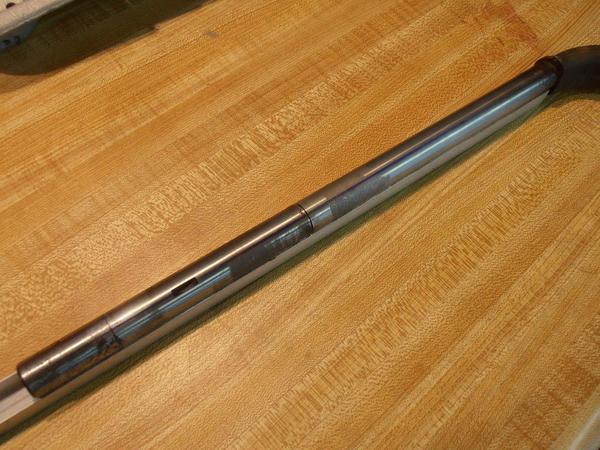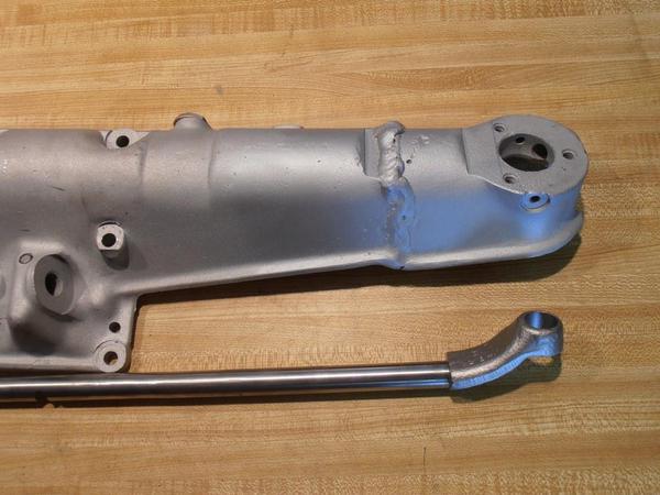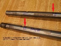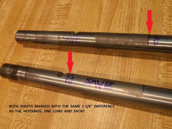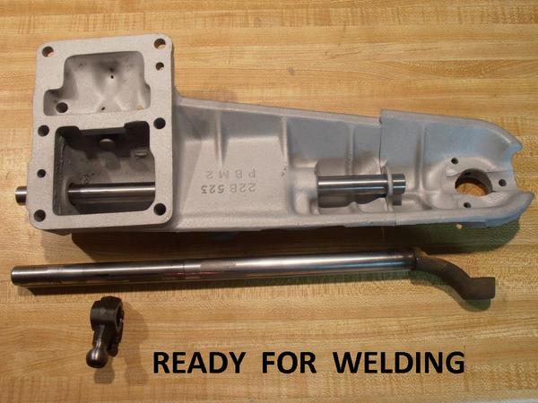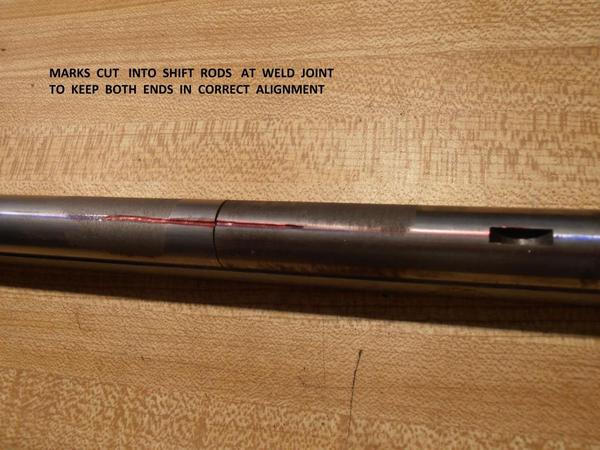 Both shafts marked with same 2-1/4" difference as the housings, one long and short. Marks cut into shift rods at weld joint to keep both ends in correct alignment. Ready for welding