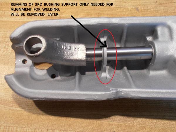 Remains of 3rd bushing support only needed for alignment for welding. Will be removed later. Bushing support ground off. Finished assembly.