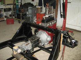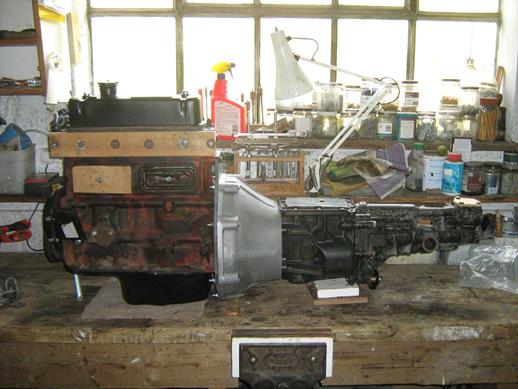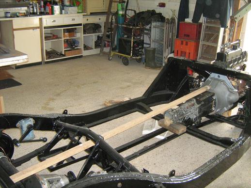 I did a trial fit of the engine and gearbox and used a straightedge to align the gearbox with the diff top bolt, assembled the gearbox rear mounting and marked out the bolt holes to be drilled in the chassis channels. I also noted which way round the backplate to bell housing bolts should be entered for future removal, exhaust pipe brackets and so on.