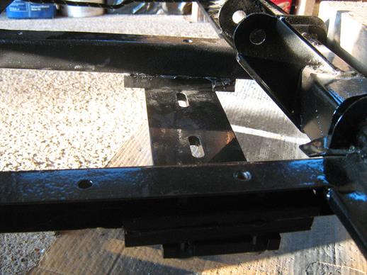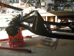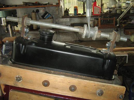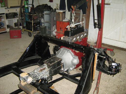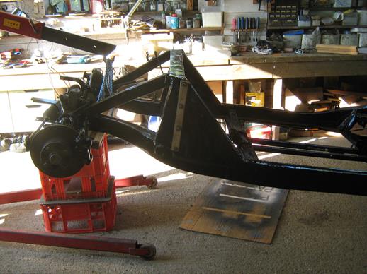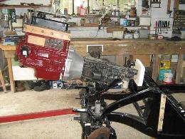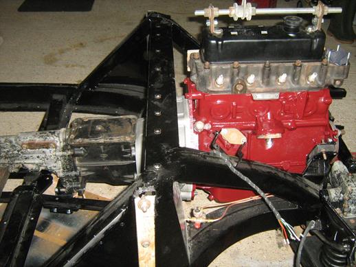 Then I removed the engine and gearbox and lifted the front of the chassis onto a support to allow space for drilling the channels. After painting the engine, the chassis was lowered, the engine and gearbox inserted and bolted up.