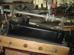A trial fit of the toe board showed that there would have to be some alteration and cutting to clear the bell housing. The pencil marks in the second picture below show the location of the toe board. I could not bear to cut up the lovely bell housing and decided to alter the toe board and tunnel instead.
