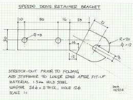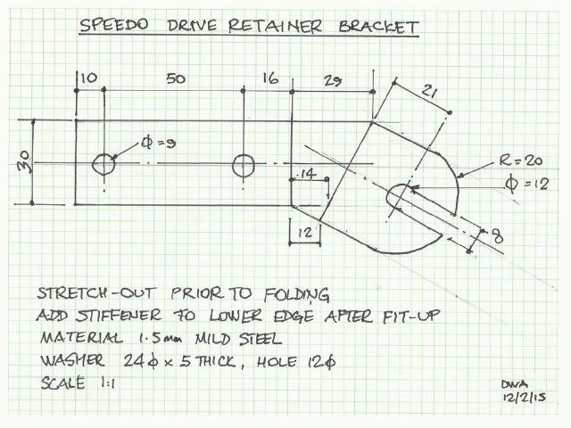 There are two 10mm holes in the gearbox casing just to the rear of the speedo takeoff and these provide a fixing for a clip to locate the speedo cable flange in the gearbox recess without a circlip. Easy to make and fit and a whole lot easier to remove when necessary without having to dig out the speedo recess to find the circlip. The speedo cable flange is held in place in its recess by a rubber washer cut from an old fridge motor mount.