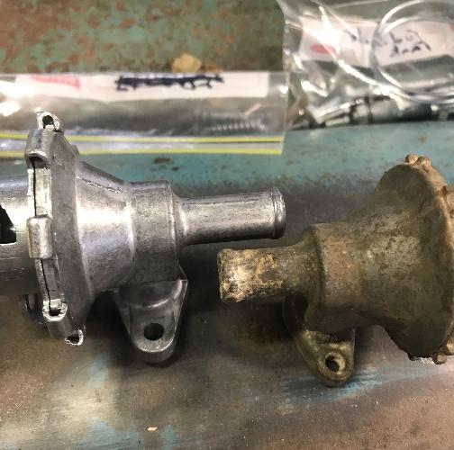 "I ordered a new heater valve for my 'time capsule' Twin Cam and noticed that the water inlet pipe on the original is about " shorter than the replacement. The fittings are yellow plated, rather than the silver of the originals. The screw that holds the clamp for the water control cable is held by a weld nut in the original but the replacement has only a thread cut into the plate (probably satisfactory as long as you don't disturb it too often).