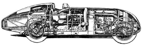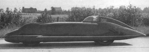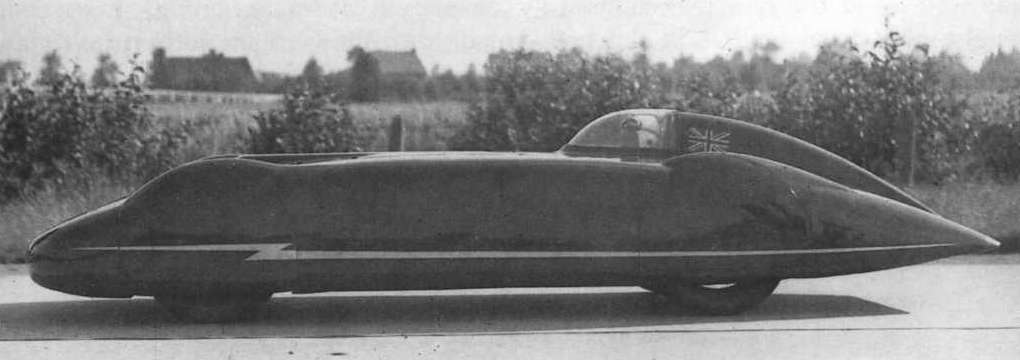 When Lord Nuffield decreed "no more racing by the factory" in 1934, Eyston sold it to Donald Letts, who later sold it to Col. Goldie Gardner. He had Reid Railton design a special enveloping body for it, a length of 197 in., width 63 in., and height 26 in., the seat being along side the angled propshaft. Gardner thenceforth, through a steady process of development (including engine changes, blanking-off cylinders to reduce capacity, and further streamlining) entered into a lengthy period of record-breaking through to the war. His first attempt, on the Frankfurt-Dessau road, achieved 187.63 and 186.567 m.p.h. for the flying mile and kilometer - the ultimate maximum achieved by the car being for the mile in 1939, at 204.2 m.p.h. (with the 1100cc engine).