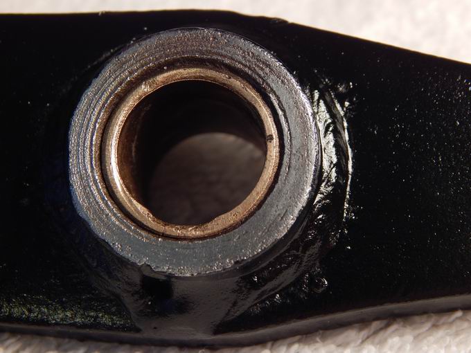 8- Coat inside of drilled surface. Insert tube, rotating tube slightly to spread epoxy, if possible. Fill epoxy in any open worn area between tube OD and pedal. I did the clutch first.