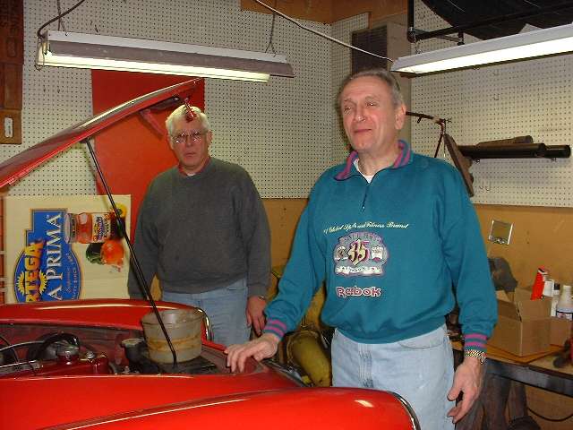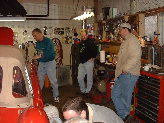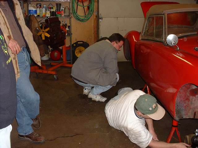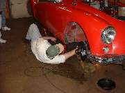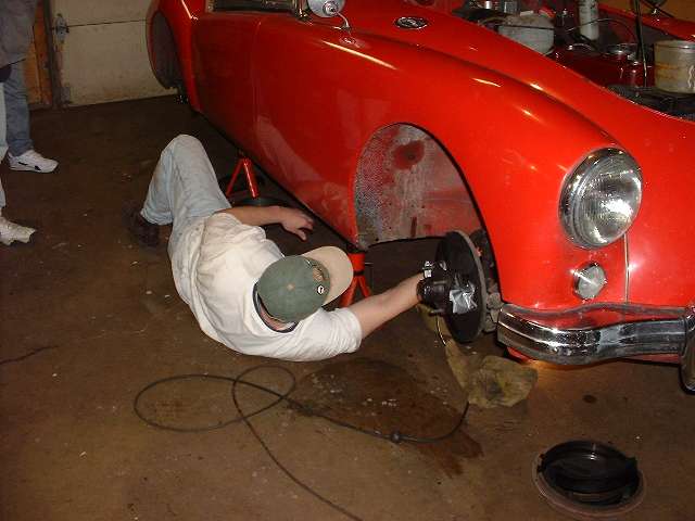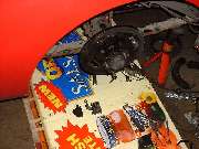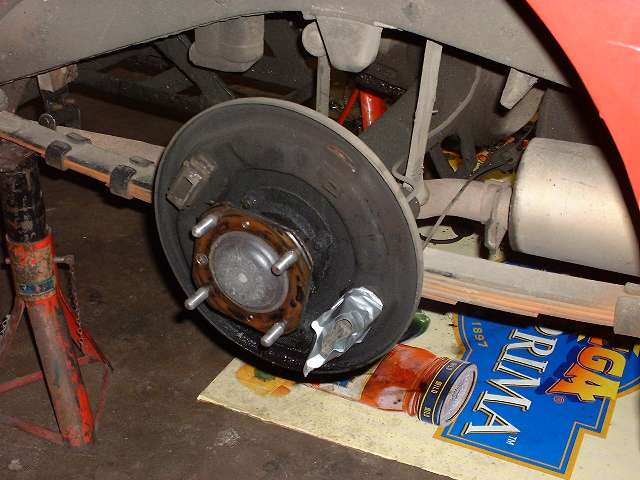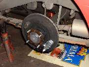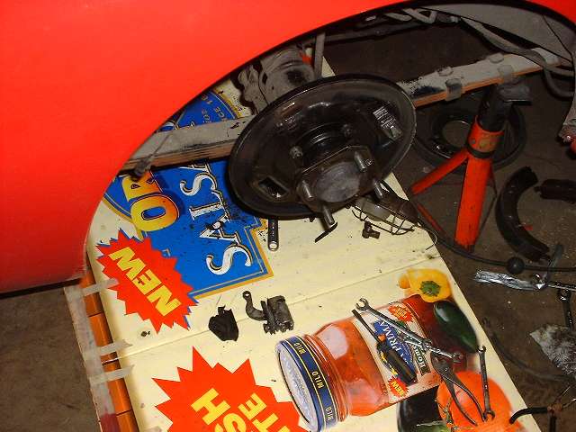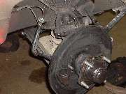 The rear brakes are also getting a new hand brake cable, along with new equalizer pivot stud and bushing and other new hardware. The right side shows the slave cylinder removed. Left side shows duct tape around the cylinder to retain the piston while the system was being pressure flushed. The third photo above shows an interresting accessory on the right front wheel. This is a hall effect sensor used as input for a rally computer. There are two bar magnets epoxied to the bearing hub (one visible). The sensor looks like the end of a threaded bolt attached to the brake backing plate with a pair of jam nuts. The lead wire from the sensor runs along the brake hose and is attached there with a few small tie wraps.