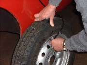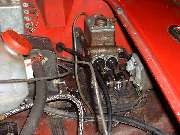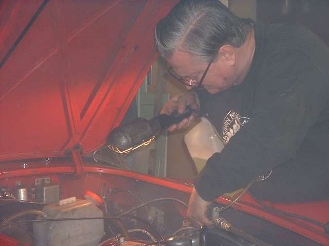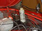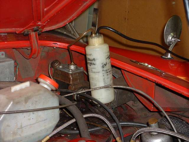As we were going to be changing the fluid type, we started by blowing all of the old fluid out of the system, then flushing it through with alcohol, then blowing that out and then blowing it dry. The Gunson Eezibleed tool makes this part of the job a cinch. The only critical part is to be sure the screw caps are leak tight, and the input hose is attached to a nearby tire valve for the air pressure supply. Once the master cylinder is pressurized the fluid comes out of an open bleed nipple in a matter of seconds. The clutch slave and four wheels makes five bleed nipples. The old fluid was out in a minute or two after hookup. Most of a quart of alcohol was then flushed through the plumbing in about a minute. This was followed by blowing air through the lines to clear out the alcohol (continuing until the tire was flat).