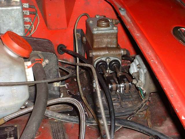 A pressure washer wand running on high pressure air is almost as good as steam cleaning. The area around the offending master cylinder was first sprayed down with engine degreaser, then pressure sprayed with a solution of Mr.Clean to remove the dirt and spilled brake fluid, then finally pressure rinsed with clear water. The body area around the master cylinder shows the effects of peeling paint caused by the brake fluid. Luckily this car had a base coating of black epoxy paint before the colored surface paint was applied, so only the color coat was affected and the black epoxy paint was still in place, so no rust. The body paint will be touched up later (maybe). The master cylinder in the picture above is now sporting new gaskets and seals, new clevises and clevis pins for the pushrods.