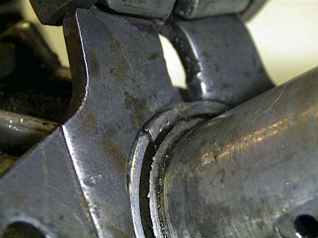You can test fit the plate on the distributor body first, while the dizzy is on the work bench. The plate should be flat, and the sides of the slotted opening at the pinch bolt should be roughly parallel and have a generous gap. If the ears touch when the bolt is tightened, the plate is badly bent and needs straightening. Picture at right shows a badly bent clamp plate and broken housing. Click for larger image.