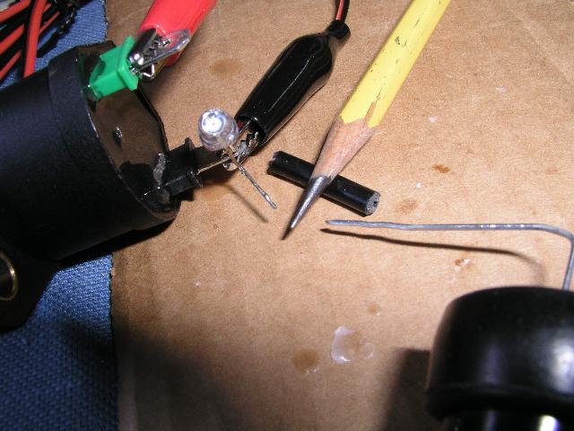 "Note that an LED is in series with the spark gap! Apparently the spark current is either too low or too brief to blow it up; it gives a nice red flash with each spark. Its presence helps to verify that with the current circuit connections the HV lead goes positive, and that conventional current (ignoring electrons) flows from the positive on the right, through the spark gaps, the pencil lead, and the LED to the negative on the left at one of the coil terminals".