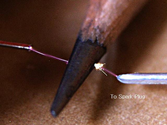 If you are still skeptical about all this, there is a quick way to check directly which way the current is flowing in the high tension circuit. Disconnect a spark wire from a spark plug (or the coil wire from the distributor cap). Hold this HT wire near a grounding point (or near the connector end of a spark plug), and position the tip of a graphite pencil in between. When you crank the engine (no need to start or run) you can observe the resulting spark jump between wire and pencil, and between pencil and ground (or spark plug). A flare (hard to see) toward the plug (or ground) shows correct polarity while a flare toward the coil shows reversed polarity. If the flare goes toward the coil, just switch the primary wires on the coil and make note of the connections for future reference.