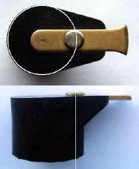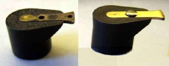 In recent years there has been a rash of bad rotors for the Lucas distributor. It has been widely rumored that too much carbon in the plastic makes it conduct spark to ground on the shaft. This cannot be true, because carbon black used as pigment and reinforcement in molded plastic rotors is non-conductive (insulating similar to the plastic). There are other reasons for rotor failure and spark leakage to the mounting shaft, mostly an issue of bad design and a misplaced rivet. Here are some examples of bad and good rotors.