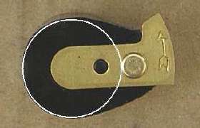 The rotor above left is a good rotor. This one has the contact bar attached by ultrasonic welding (melting and pressing down) a protruding plastic finger that works like a rivet (but non-metallic). In other cases the contact arm may be molded into the plastic part. The rotor above right is a bad rotor. This one has the contact bar attached with a metal drive rivet, and the rivet is too close to the driving shaft. Pictures at right illustrate this point. The white circle represents diameter of the insulating base of the rotor. The rivet is clearly positioned inside of the circle, therefore leaving less insulation between the rivet and the shaft. Failure mode here is for spark to arc through the insulation between the rivet and the metal shaft.