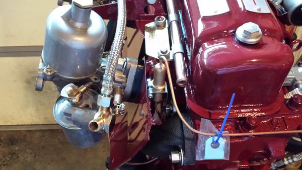 The metal pipe should be all one piece from carburetor to distributor with a fuel separator bulb in the middle. The bulb is filled with wire wool with the metal pipe on each end to serve as a fuel separator. The bulb goes upright with bottom end connected to carb and top end connected to dizzy. The bracket holding the bulb was originally mounted on the second manifold bolt from back. However, with engine in the car you may find it easier to install the bracket on the rear manifold bolt. The P-clip goes on the rear head stud. Use a second nut there if the stud is long enough. Otherwise you have to R&R the nut to install the P-clip.