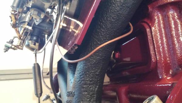 I would not attempt to wrap the vac pipe around the rear exhaust runner as shown here. Run the pipe downward from the fuel separator between the center and rear branches of the exhaust manifold, under the heat shield, and back up to the carburetor vac port. Form the pipe close to the heat shield to stay away from your wrench access.