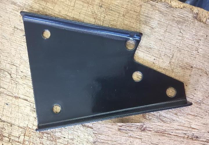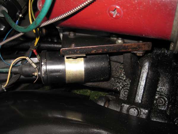 The MGA 1600 ignition coil will be angled a little outboard and upward, positioned above and parallel to the chassis frame tube just inboard of the inner fender. Photo below left shows an original factory bracket. Photo below right shows a hand made part with the outboard flange turned down rather than up, for better access for easier wrenching on the motor mount bolts.