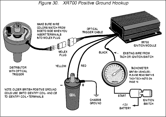 The same unit can be wired for either negative or positive earth setup. Compare the two diagrams above (from the PDF instructions). The module only needs + and - battery connections, and it cares not which one happens to be grounded to the chassis. The new pickup module in the distributor does not ground through the distributor body, so the entire electronic system is "floating" until one of the power leads is grounded.