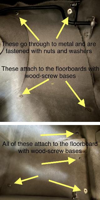 The only bound edges for original carpet were around the back edge of the tunnel front and center carpet pieces where they over-lap on top of other carpet, around the snap down cover for gearbox oil fill and dipstick, and around the cut-outs around chassis cross member in front of the seats. Moss Motors supplied carpet sets are as original. Some aftermarket carpet may have all edges bound for the foot well pieces (can't be trimmed), or may have some thin padding incorporated into the carpet itself. The rear tunnel carpet piece had the armrest sewn onto it and an access slot underneath so the Dunlopillo cushion could be pressed onto the armrest after attachment.
