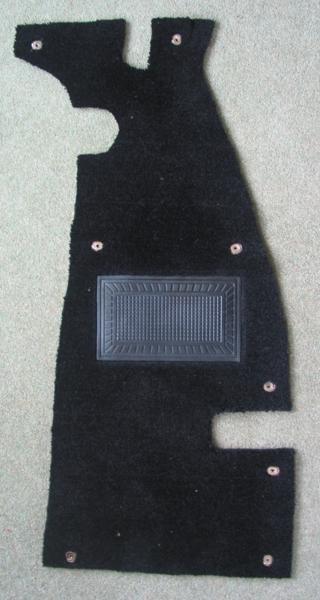 fasteners on carpet in the foot wells (as original) for easy removal for cleaning and drying (does get wet occasionally). Standard length LTD studs work well with 3/8" thick padding in place. Carpet under the seats can be slit to go around the seat rails and can be left loose with no fasteners. It lays there nicely without moving and can slide out the back for service. I take time (considerable fiddling) to carefully trim the floor carpet to fit perfectly around the sides and into the corners, looks neat and helps to immobilize it. The first photo is foot well carpet for right side of RHD 1600. The second photo is foot well carpet for right side of LHD 1500. The gearbox dipstick cover flap was secured with a durable dot press stud fastener (snap).