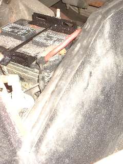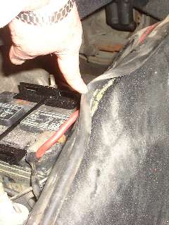 The seal is soft and will conform to the battery cover position, if the toe board is high enough. After 50 years of service most cars have the floorboards replaced, some battery covers may be deformed, and some body restoration work may relocate the battery cover slightly. The final configuration may not necessarily be exactly as original (and original may not have been in perfect alignment). In photos below you can see dust on the carpet in area of the outboard angle of the toe board, indicating not perfect seal in that area. My battery cover sits on top of carpet at the ends, which may not be original. Thickness of carpet there raises the cover ends slightly, perhaps as much as 1/8-inch after compression. In this case it may be prudent to install some foam rubber or other backing strip between the seal and top of the toe board to raise the seal to be better aligned with the cover. It is likely not a big chore to modify this installation after the fact (although staples may be easier to remove than glue).