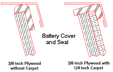 It appears that the rubber seal may have been intended to work with or without carpet on the heel board. In schematic it looks best installed with the thick edge on top and the longer edge down, as shown above center. Many people report good success gluing the seal in place on clean painted plywood, although staples may work as well (especially on older or dirty plywood). If you install the seal before carpeting, you might truncate the carpet at bottom edge of the seal. There might be space to lay carpet over the seal right to top of the toe board, but you should check fit of the battery cover before to try that.