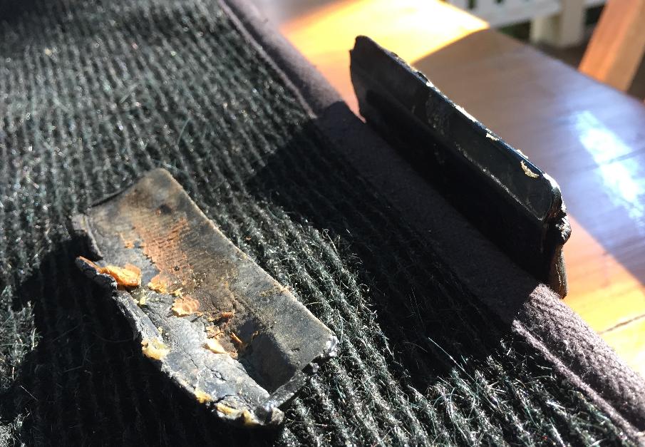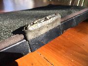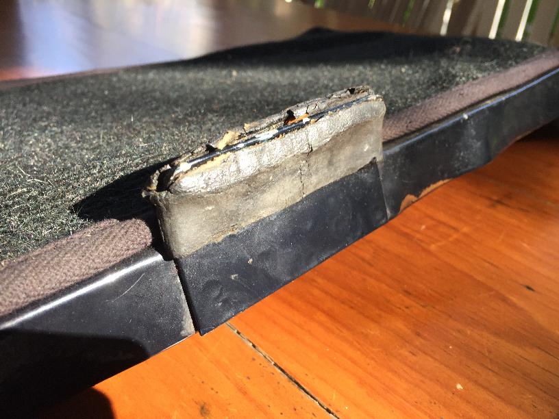 "Attached are some pictures of the remnants of my original rubber cover for the handle on the battery cover. The handle has a bend towards the front of the car about 1/3 of the way up. The rubber is a single piece, smooth on each side, that followed the shape of the handle. The pressure of the side screens has distorted it somewhat".