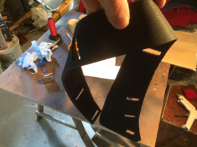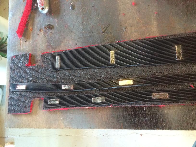 My method of carpet fixing with magnets is more easily explained with photos than text. Basically there are ribbed rubber backing pieces cut to fit to the steelwork along the inner sides and the gearbox/trans tunnel. Strong magnets are let into the rubber and glued in with superglue. I have used rectangular magnets because the cutouts are easy to make and the magnets are 5mm thick, the same as the rubber sheet. With the rubber pieces fitted in position in the car the carpet pieces are then very firmly glued to the back of the magnets and to the rubber. (Note: a good way to temporarily hold the carpet firmly down to the magnets whilst the superglue is setting hard is with another set of magnets on top which jump into position most helpfully).