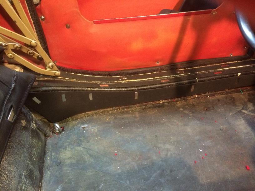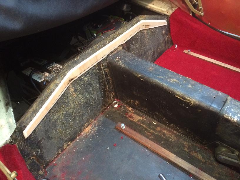 I have devised a method of fitting removable carpets: The front floor pieces are fitted as originally with the LTD fasteners. The rear floor pieces, under the seats are left loose. The rear bulkhead carpet piece is glued to a shaped ply hanger which is screwed with two 2BA set screws to the top of the plywood bulkhead with washers and wingnuts accessible under the battery cover. All of the rest of the carpet is held in place with neodymium magnets.